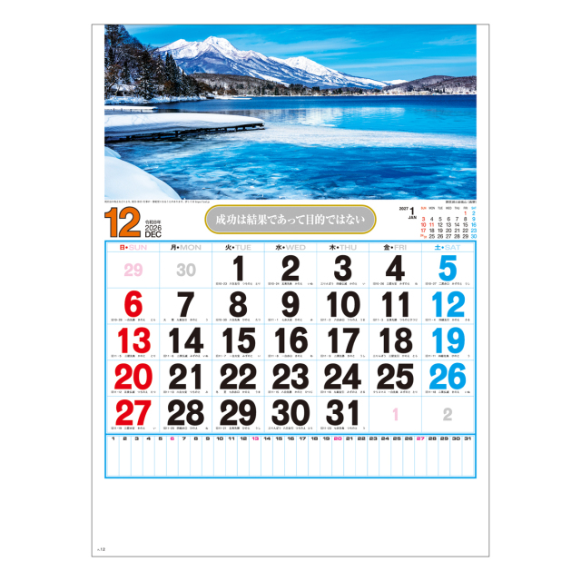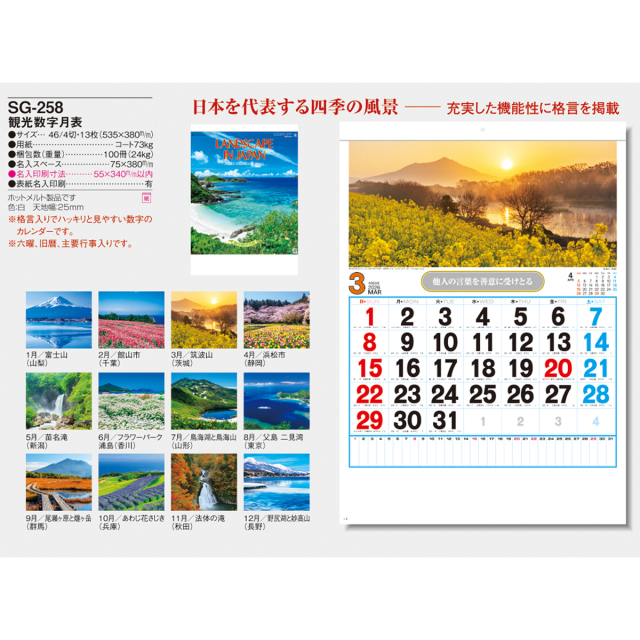 美しい日本の四季の風景に、大きく見易い日付。広いメモスペース、毎月の格言、六曜や行事など、使い勝手も考慮したカレンダーです。※専用ポリチューブ付