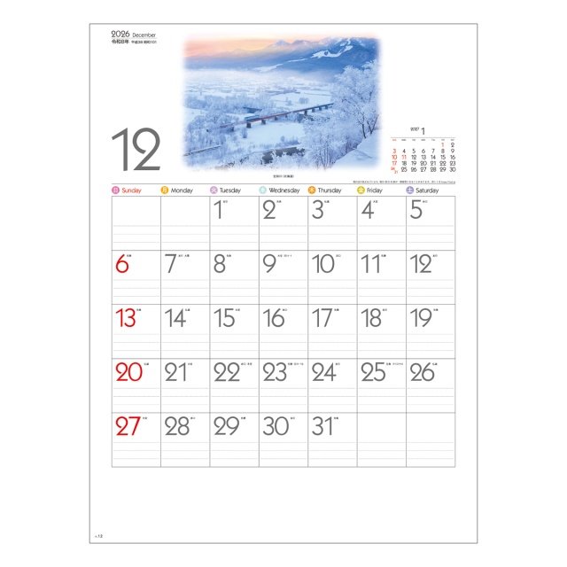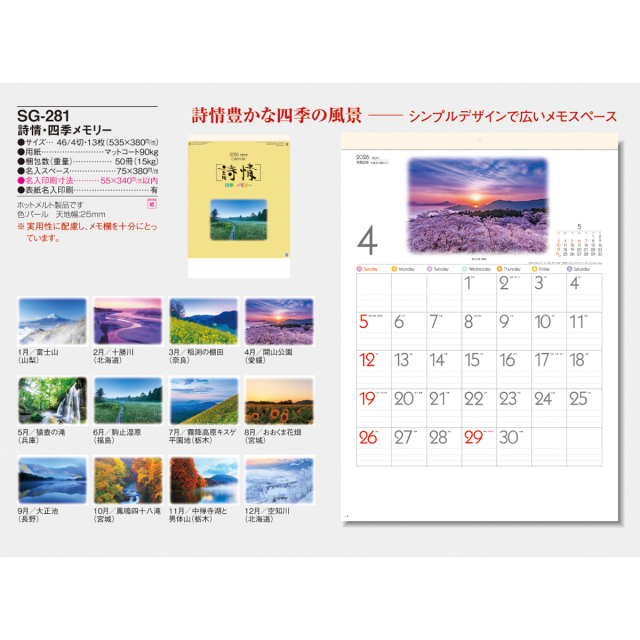 日々の流れに詩情豊かな風景を添えて・・・。十分書き込める大きなメモ欄、六曜などの暦機能も付いた、現代のニーズに合った壁掛けカレンダーです。※専用ポリチューブ付
