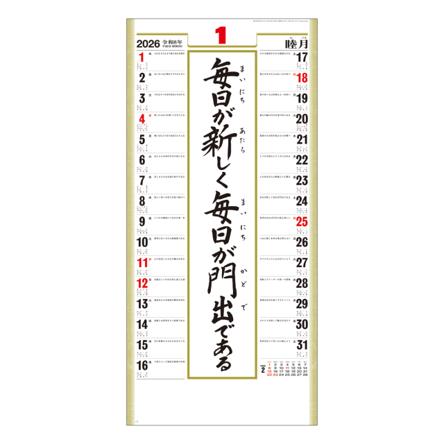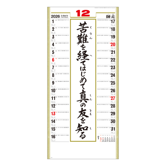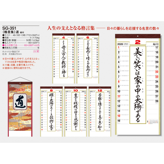 広いメモ欄についた1日ごとの警句。日々の生活の中で、心の支えとなってくれる格言が好評のカレンダーです。身近においてお役立てください。※専用ポリチューブ付