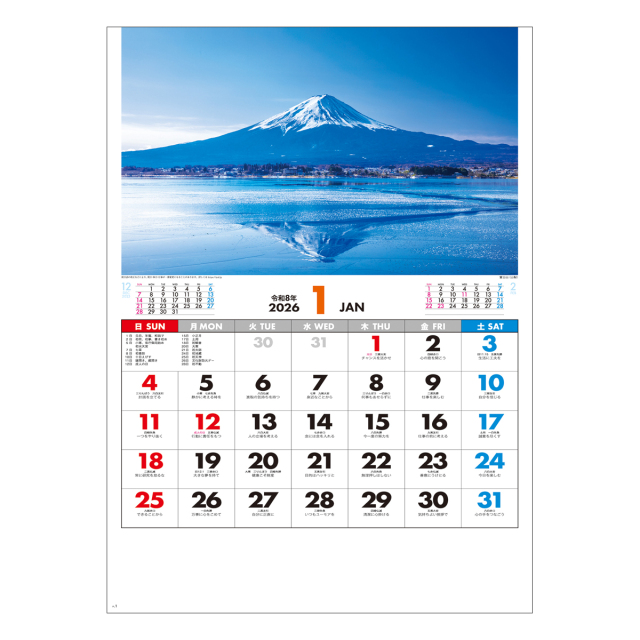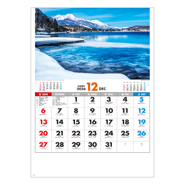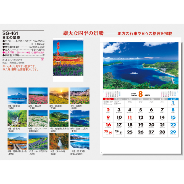 雄大な自然が目を楽しませてくれます。各地の行事や祭り、前後月、日々の格言なども付いて、使いやすさも充実した美しいカレンダーです。※専用ポリチューブ付