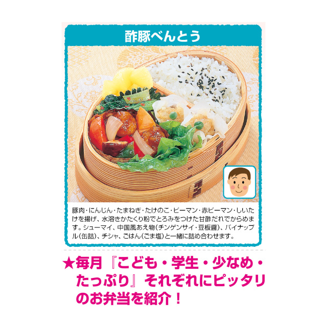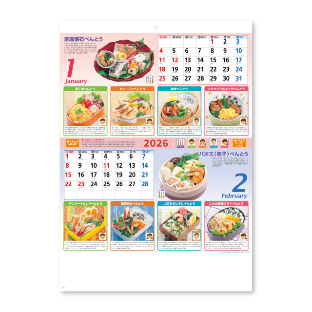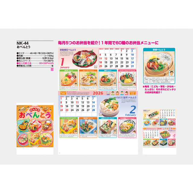 見た目もきれいなおいしいお弁当メニューを紹介したカレンダーです。毎月5つ、1年間で60種類になります。毎日のお弁当の参考におすすめです。※専用ポリチューブ付