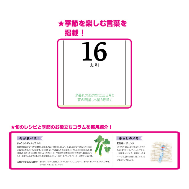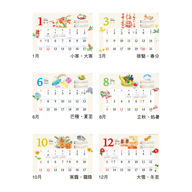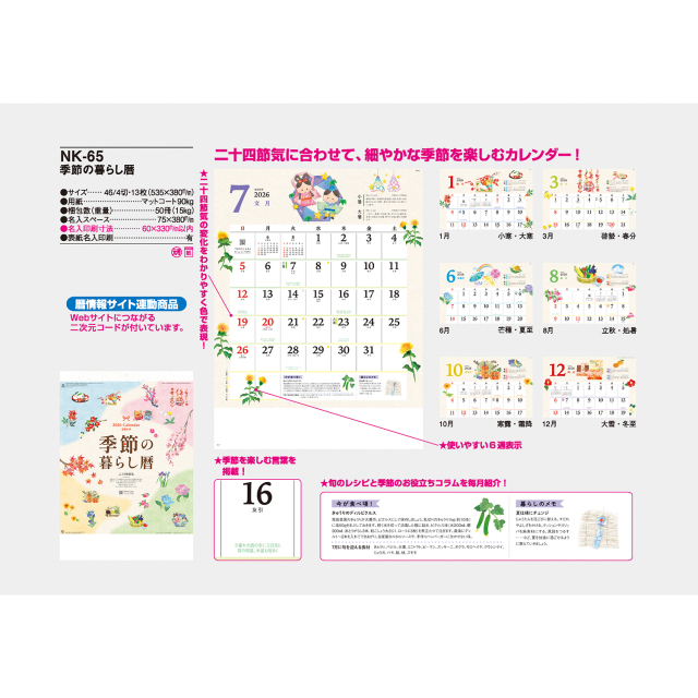 季節に合わせて日々を豊かに暮らせるカレンダー!二十四節気の変化を色で表現。季節を楽しむ言葉や、旬のレシピと暮らしのメモを掲載しています。※専用ポリチューブ付