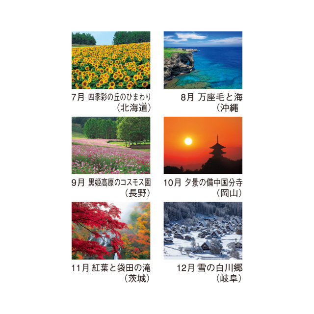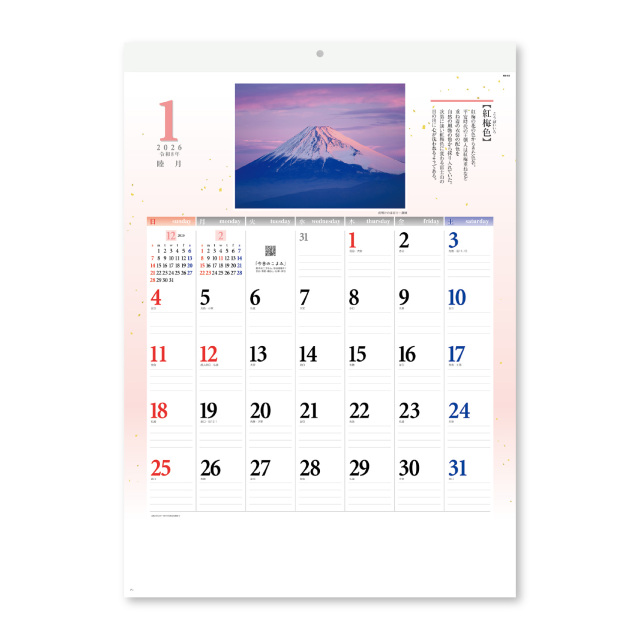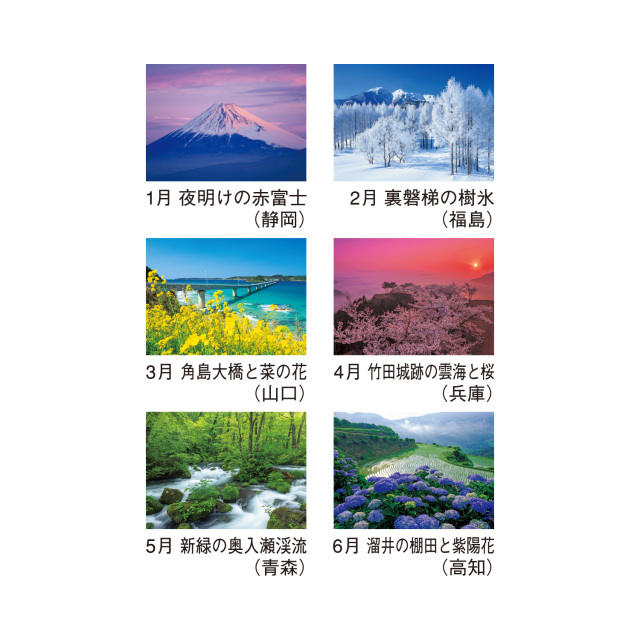 日本の伝統色に合わせ、日本ならではの風景写真を選んだ和のカレンダーです。情緒的な写真を大きく配置し地名も記載。インテリア性の高さが人気です。※専用ポリチューブ付