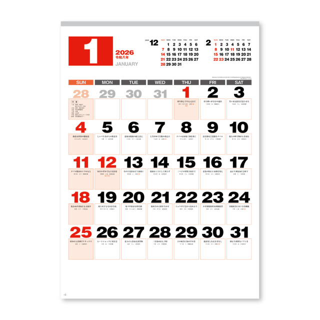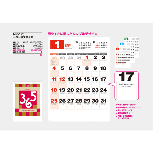 見やすさに徹したシンプルなデザインのカレンダーです。六曜や二十四節気なども掲載。一日一訓のことわざと広いメモスペースが毎日の暮らしに役立ちます。※専用ポリチューブ付