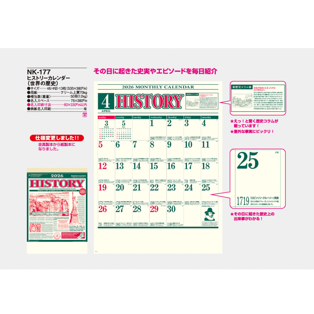 その日に起きた史実や、エピソードを毎日紹介。歴史上の出来事が分かって幅広い知識を得ることができる、学べるカレンダーです。※専用ポリチューブ付