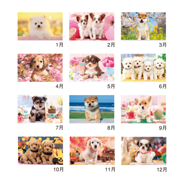 かわいい子犬の写真がたまらない、癒し系コンパクトサイズカレンダー。メモ欄、六曜も付いて実用性も抜群の、とっても便利な名入れカレンダーです。※専用袋付