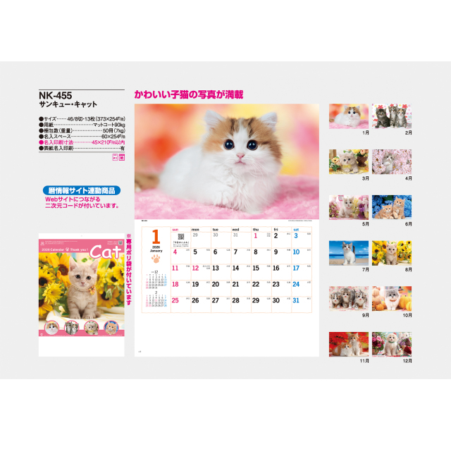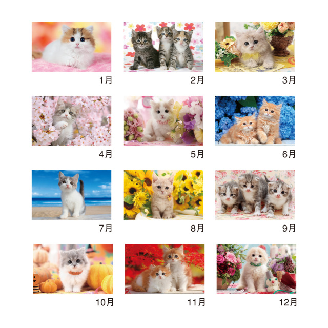かわいい子猫の写真がたまらない、癒し系コンパクトサイズカレンダー。メモ欄、六曜も付いて実用性も抜群の、とっても便利な名入れカレンダーです。※専用袋付