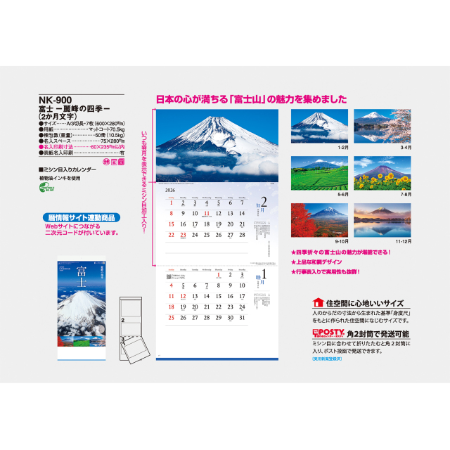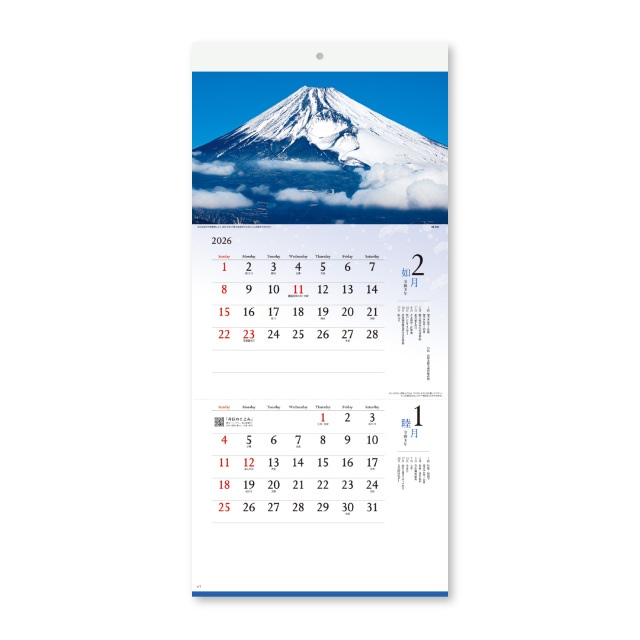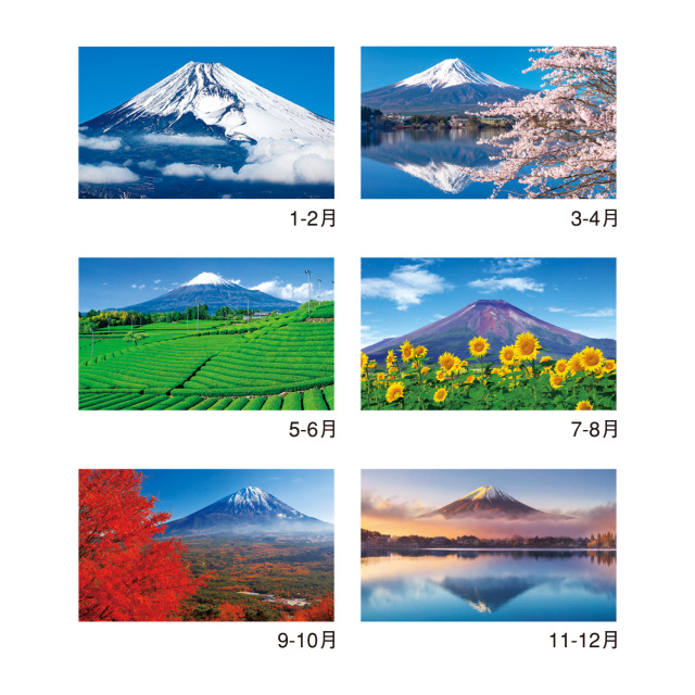 日本の心「富士」の魅力を、さまざまな角度からとらえました。2ヶ月タイプのミシン目入りで、常に翌月の暦が見られるカレンダーです。※専用ポリチューブ付