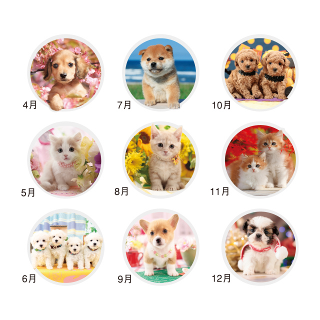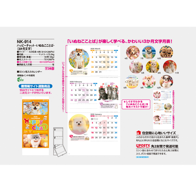 かわいい子犬と子猫の写真満載。いぬねこことばが楽しく学べる癒やし系カレンダーです。3ヵ月の文字月表で2か月先までスケジュールを管理できます。角2封筒で送れるポスティタイプです。※専用ポリチューブ付