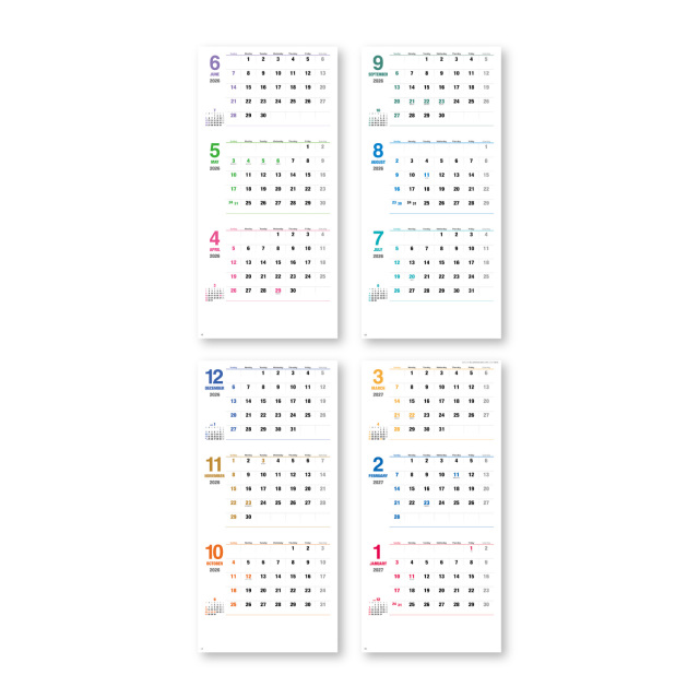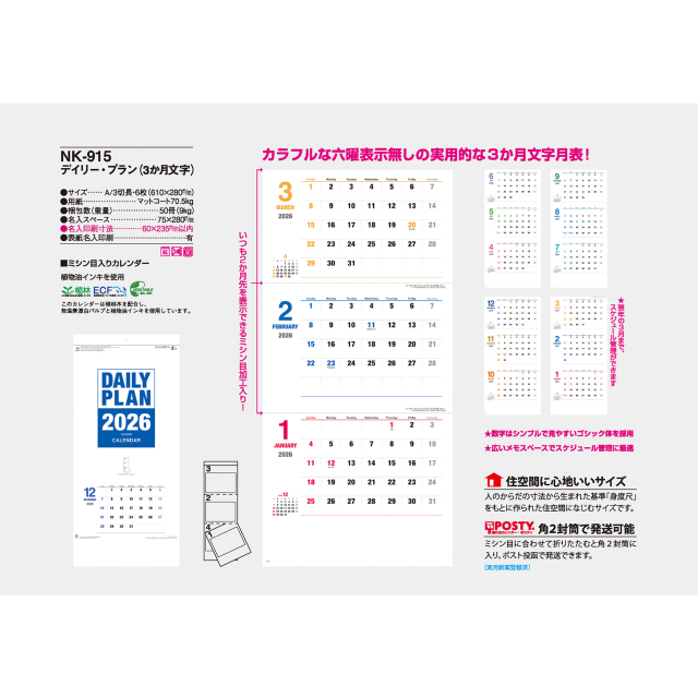 実用的な3ヵ月文字タイプのカラフルなカレンダー。六曜無しのシンプルデザインでスッキリ見やすく、手頃なサイズで場所も選びません。角2封筒で送れるポスティタイプです。※専用ポリチューブ付