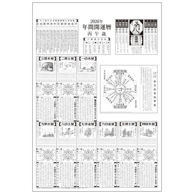 元祖、九星占いカレンダーのジャンボサイズカレンダー。本家本元と評判の神栄館監修による運勢と吉日判断を兼ね備えた決定版です。365日の吉凶がわかる機能が好評。※専用ポリチューブ付