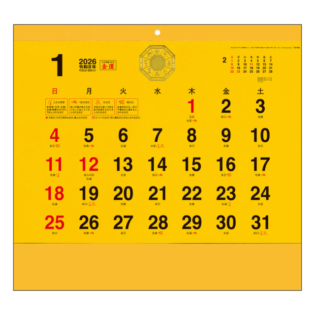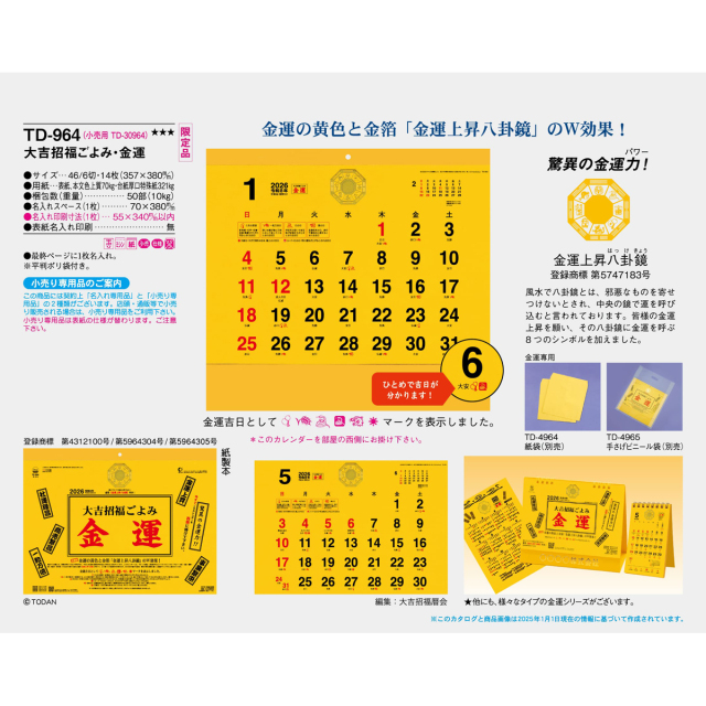 風水では、八卦境が宇宙のパワーを取り込み金運を上昇させるといわれています。その八卦境に金運を呼ぶ8つのシンボルを加えた大吉招福金運カレンダーです。※専用平判ポリ袋付