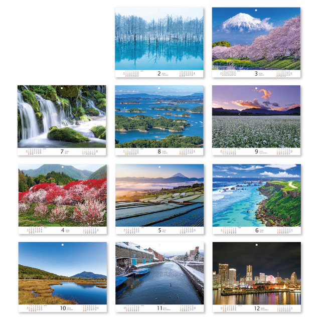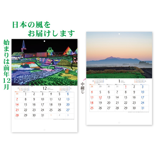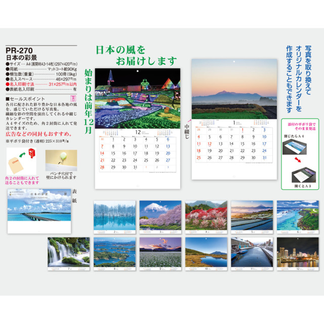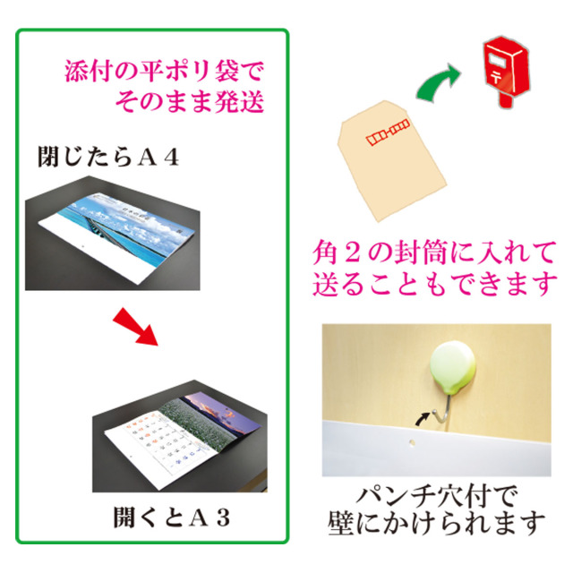 各月に配された彩り豊かな日本各地の風を感じていただける文字月表です。中綴じ仕様で開くとA3、閉じるとA4サイズになり、角2封筒で郵送できます。広告などの同封もおすすめ!※専用袋付