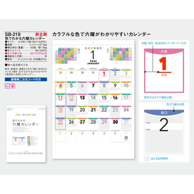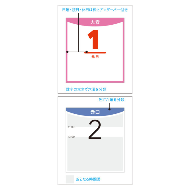 色や文字の太さや色でわかる視覚的に表現したカラフルなカレンダーです。開店、結婚式、葬儀などに使い勝手が良く便利です。※専用ポリチューブ付